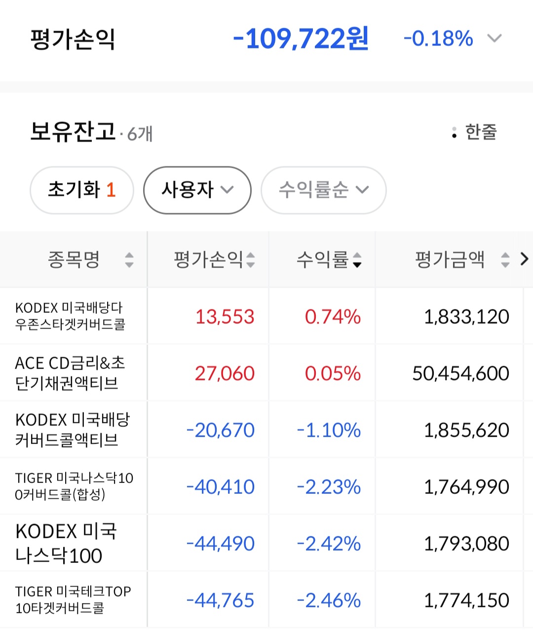 또, 퇴직연금 -0.18%, ISA -0.77%, 개인연금 0.95% 손실을 보고 있습니다. 지금 저의 계좌를 보시면 단기채권 비중이 상당히 높다는 걸 보실 수 있습니다. 저는 이번 조정장일 땐 조금씩 주식을 사모아갈 예정입니다. 조정장일 땐 배당률을 높은 커버드콜을 구매할 예정이었으니 이번 주식장을 보면서 생각이 많이 바뀌었습니다. 커버트콜을 레버리지 투자를 할 수 있는 ISA계좌에서만 할 예정이고 지금부터 다시 개인연금, 퇴직연금계좌로 KODEX 미국나스닥 100, SNP500, 현금을 4:3:3 비중으로 채울 예정입니다.