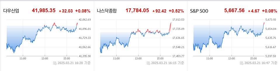 다우, 나스닥, S&P500 전부다 약 상승을 보여주고 있습니다. 아직은 트럼프 관세 정책의 불확실성은 사라지지 않았다는 점을 염두하고 투자에 임하셔야 됩니다. 4월 2일에 주가가 어떻게 변동을 보일지 알 수 있을 것 같습니다.