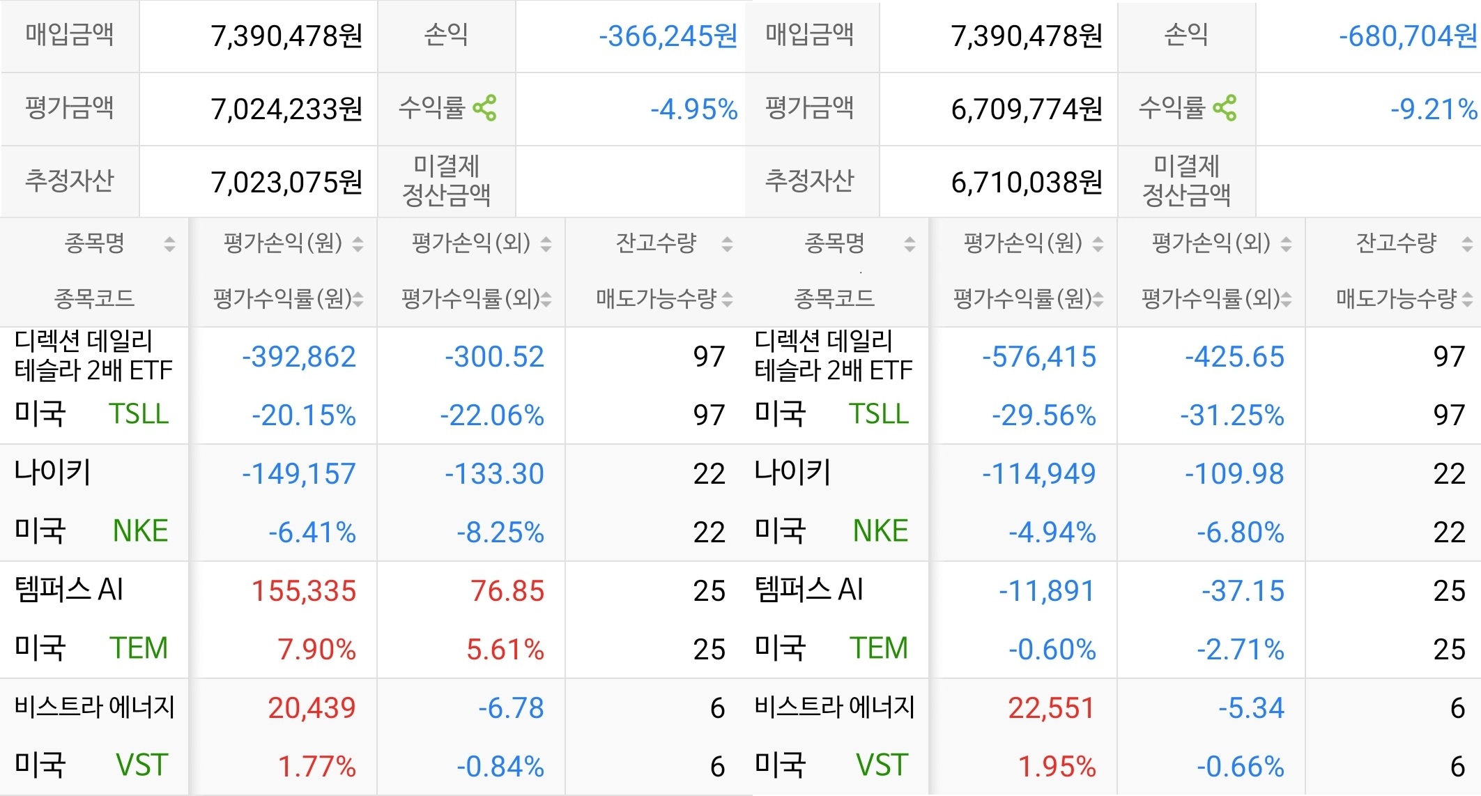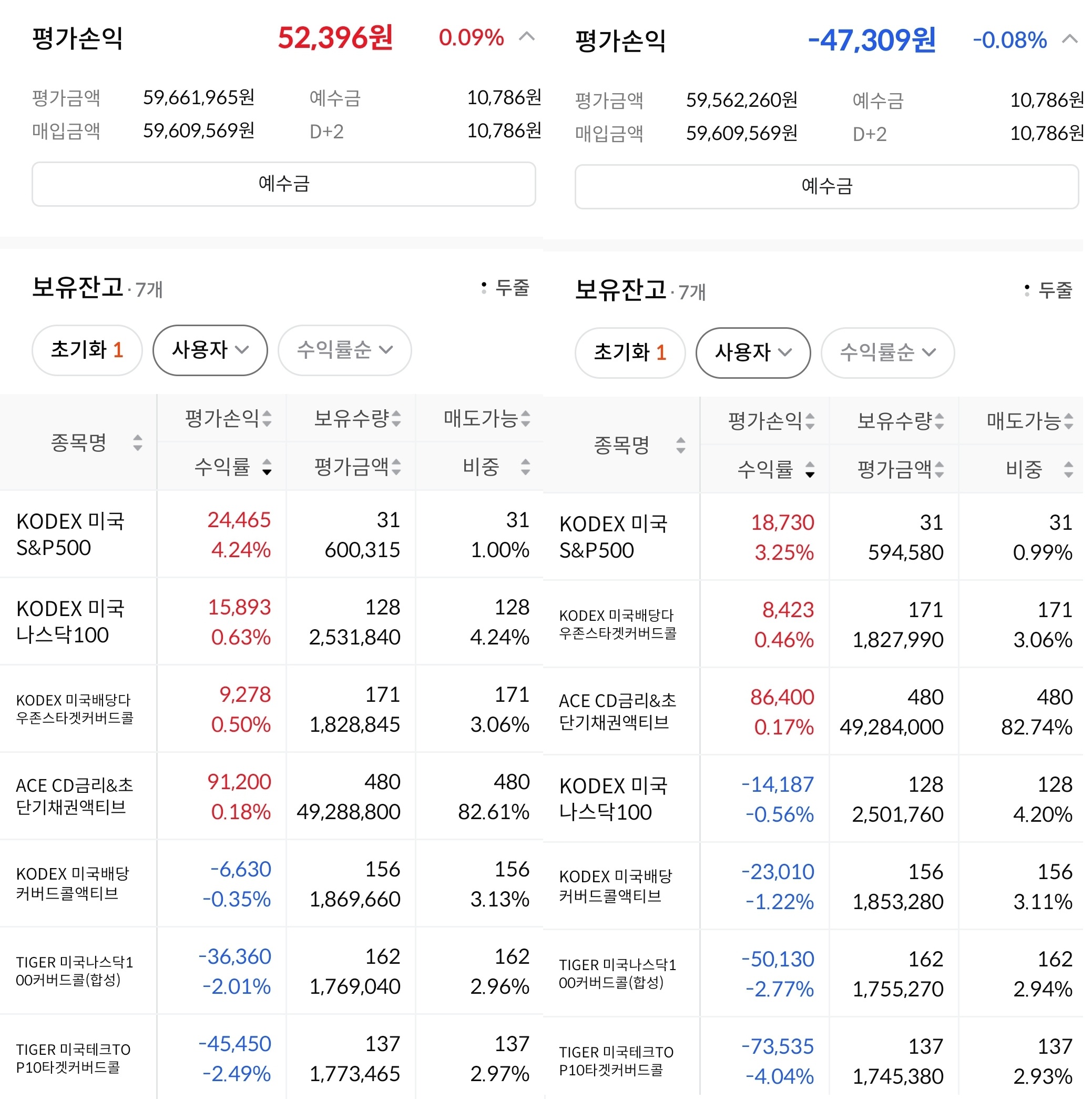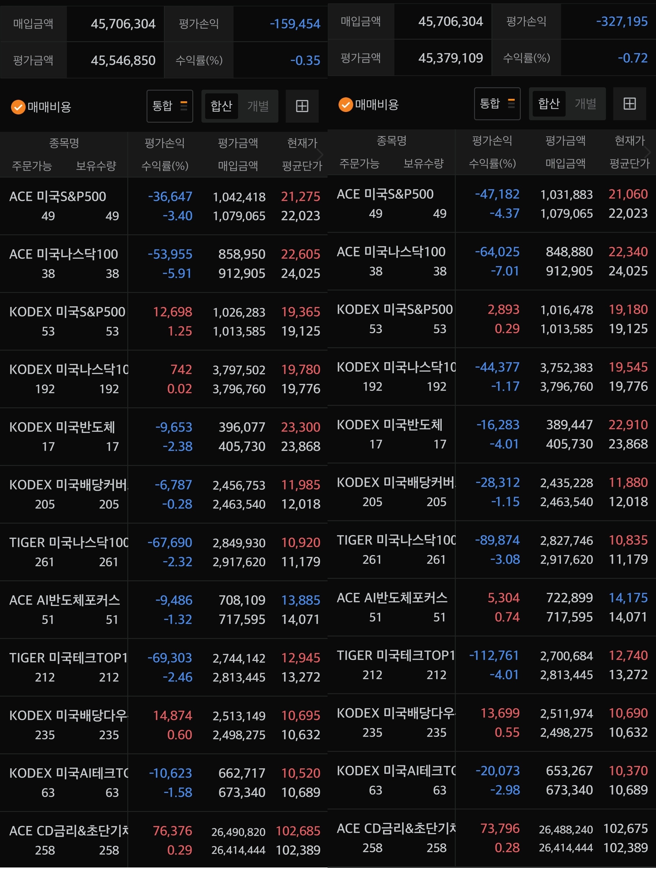아직은 불확실성으로 인해서 주식이 반등해서 오른다고 말할 수는 없지만 고점에서 약-10% 정도 떨어지는 건 허다 하니 너무 정신적으로 힘들어하실 필요 없다고 말씀드리고 싶고 이럴 때 조금씩 더 수량을 담아간다는 생각 해주시면 좋습니다.