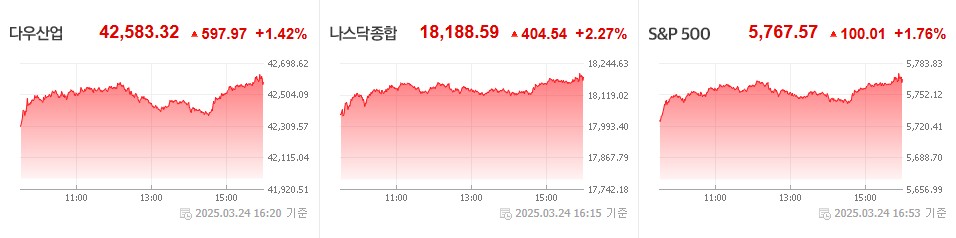 다우, 나스닥, S&P500 다 상승을 해주는 모습입니다. 조금씩 사모았기 때문에 평단가를 낮추었고 아직은 트럼프의 관세 정책이 확정이 아니기 때문에 변수가 있다고 생각하기 때문에 오른 수도 떨어질 수도 있습니다. 그건 아무도 모르기에 4월 2일 트럼프의 방향성을 확인하고 투자하시면 됩니다. 모두가 미국주식은 끝났다고 생각하고 유럽주식을 하시는 분들도 계시는데 결국은 미국주식이 변동성이 큰 만큼 상승도 이때까지 더 컸습니다.