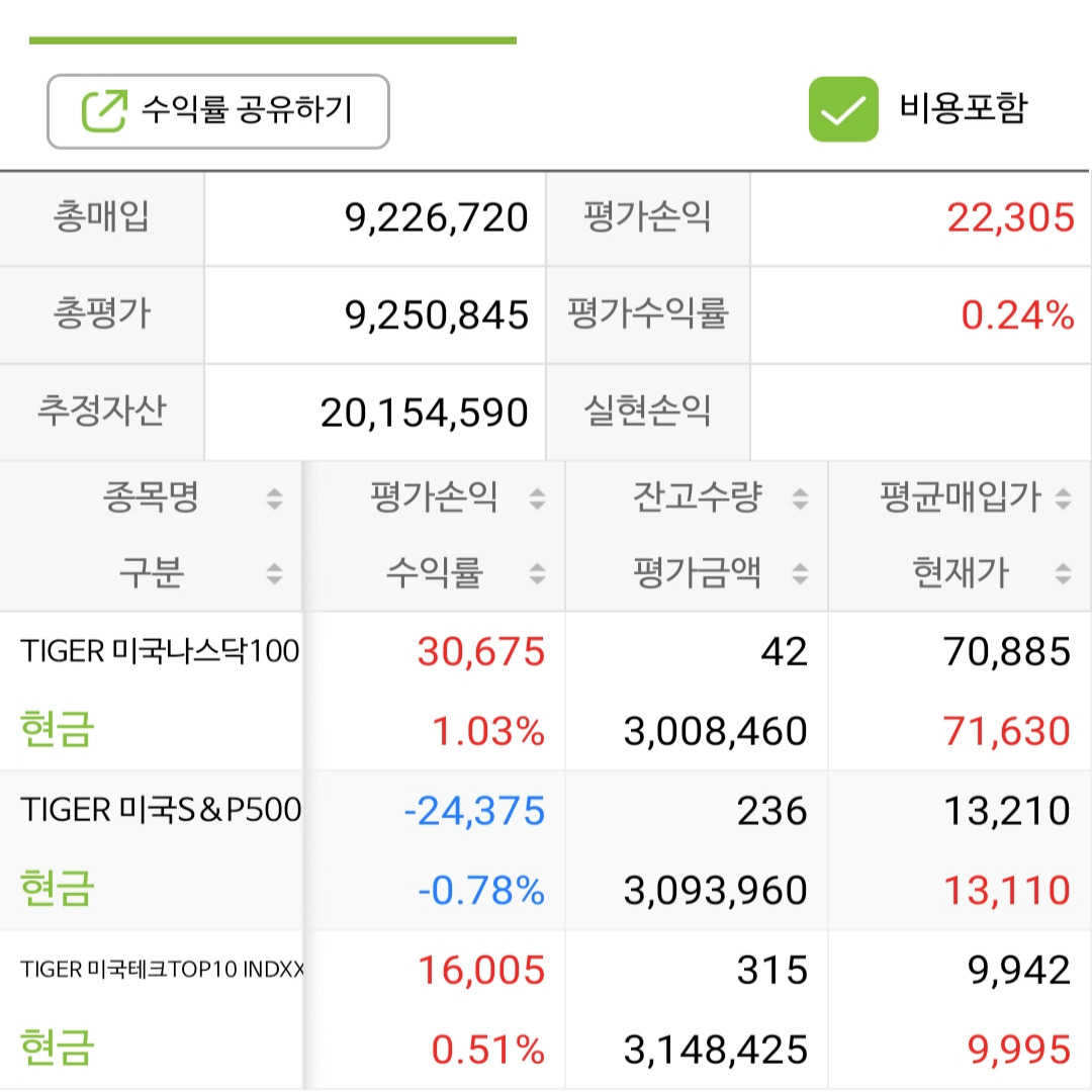 저는 TITER 미국 나스닥 100, TIGER 미국 S&P500 종목을 투자했고 20, 60, 120일선 닿았을 때 월 35만 원 납입했던 금액을 가지고 투자를 했습니다. 그 결과 잔고수량이 늘어난 상태이고 주식이 회복을 하자 양전하는 모습을 볼 수 있습니다.
