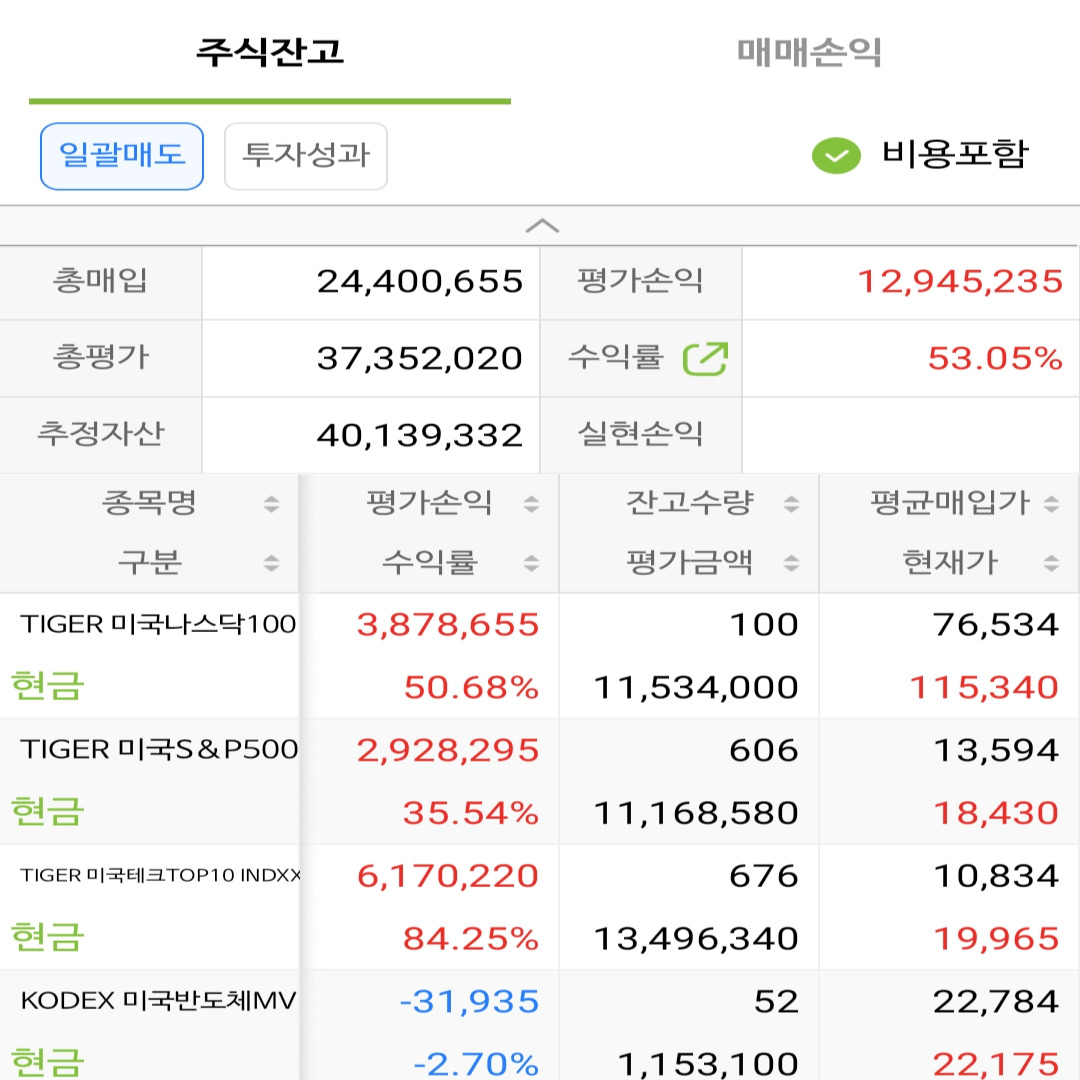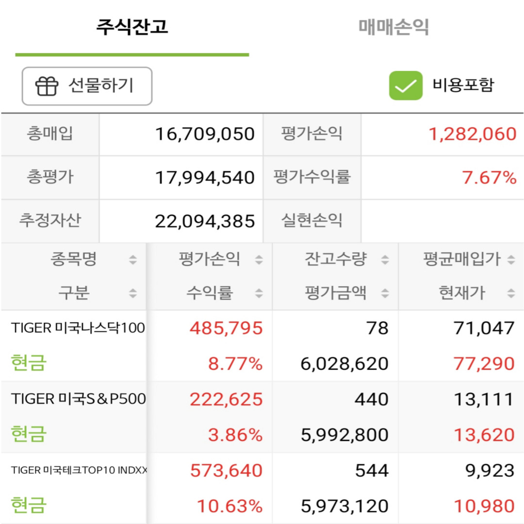 사진을 보시면 TIGER 미국테크 10 INDXX를 투자하다가 수익을 익절하고 KODEX 미국반도체 MV로 변경하였습니다.